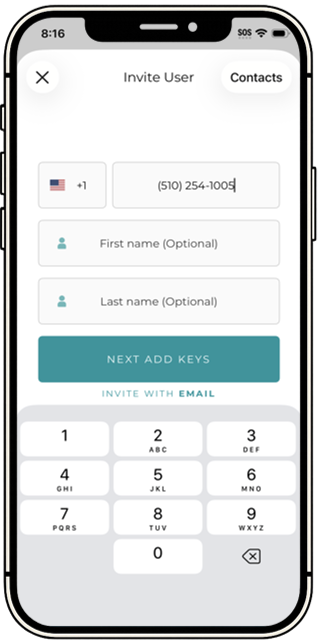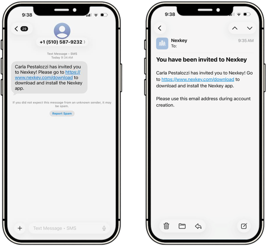 Once the invite has been sent, the recipient will either receive a text message or email letting them know that they've been invited. Please note: If the recipient has previously created a Nexkey account, they will instead receive an app notification.