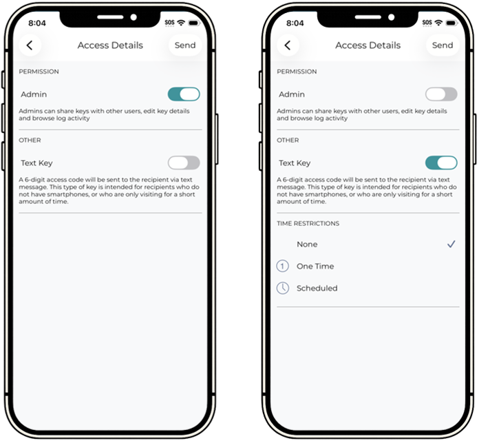 Text Keys are exclusive to the Nexkey Controller. This will allow the recipient to unlock your door via a 6-digit access code that will be sent by SMS text message. This is best used in cases where you don't want the recipient to download the app and create a new account.