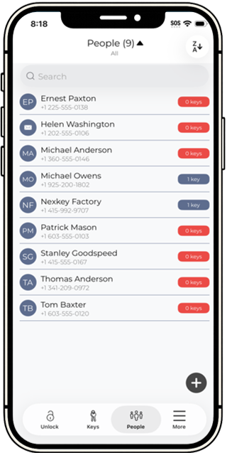 In the Nexkey app, tap PEOPLE in the navigation bar below. Here, you will see a list of people you've already given access to. You'll also see the number of keys that they currently have to the right of their name.