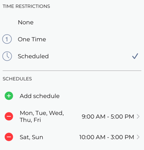 Scheduled: Allows you to create a window of time that the door can be unlocked. You can add multiple schedules as long as they don't overlap.