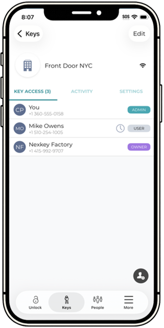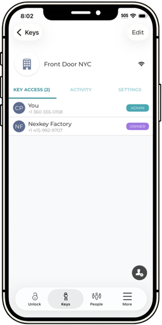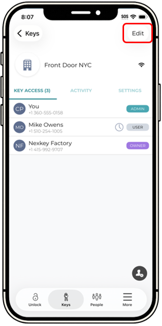 To revoke a key from your Nexkey device, Navigate to theKey Access tab and tap EDIT in the top-right corner.