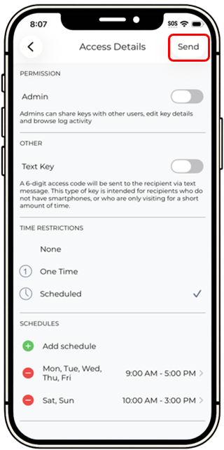 Once you're all set, tap SEND at the top right corner to finalize your changes. You will see your recipient added to theKey Access tab shortly after.