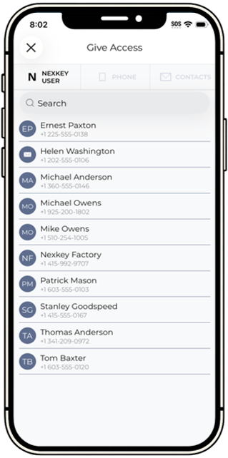 Contacts: If the Nexkey app has permission to access your phone's contacts, you can search from that list to find your recipient as well.
