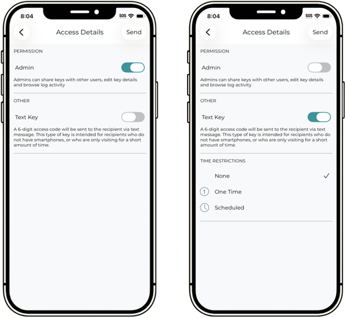 Text Keys are exclusive to the Nexkey Controller. This will allow the recipient to unlock your door via a 6-digit access code that will be sent by SMS text message. This is best used in cases where you don't want the recipient to download the app and create a new account.